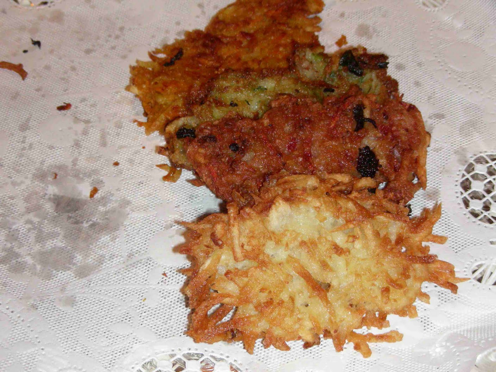 A vegetable is grated, mixed with a binder, formed into patties which are fried. My latke rainbow was made with four different types of veggies. You can see from the color differences in the picture below, the type of vegetable is not that important.